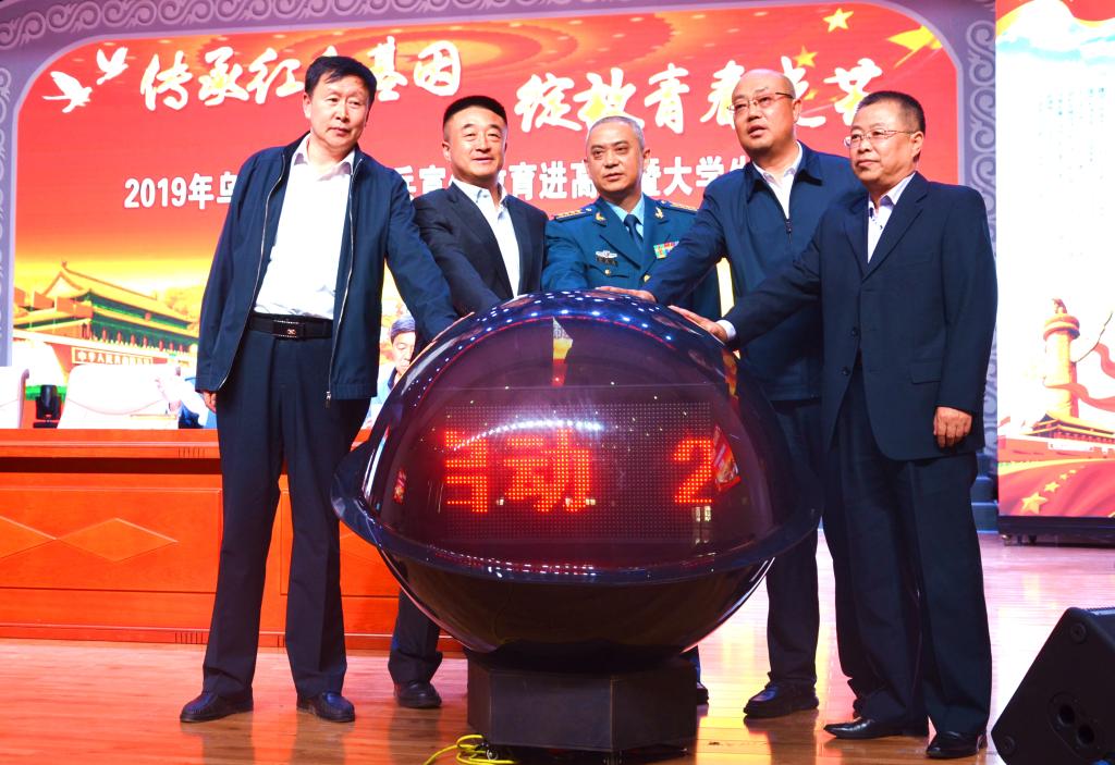 最后,郭晓民宣布2019年全市大学生征兵工作正式启动。郭晓民、刘春、李晓帆、王广文和逯全仓五人共同按下启动仪式按钮。