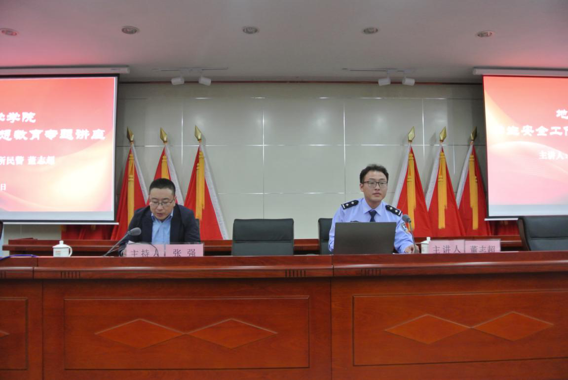 董志超警官从打架斗殴、交通安全、网贷校园贷、传销防范及其危害、扫黑除恶、大学生网络舆论安全问题等几个方面给地科院师生作了精彩讲座。他用鲜活生动的案例向同学讲解了怎样识别不安全因素,深入浅出地总结了提高大学生安全意识的具体方法与对策,生动鲜活的案例和幽默风趣的语言,赢得同学们的阵阵掌声。董志超警官的讲座具有很强的针对性和实用性。