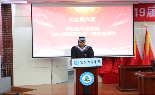 地理科学学院院长王培青致毕业辞。王培青代表地理科学学院全体师生对毕业生送上最热烈的祝贺和最美好的祝愿,他对毕业生提出共勉:希望你们做一个终身学习、勤于思考的人;做一个怀揣梦想、求实创新的人;做一个心存敬畏、行知廉耻的人;做一个心怀感恩,热爱生活的人。他说,学生们不忘初心、奋力拼搏、成就梦想的精神,奋斗的足迹将永远铭刻在母校的历史上,愿同学们在此扬帆起航,百舸争流挂云帆。