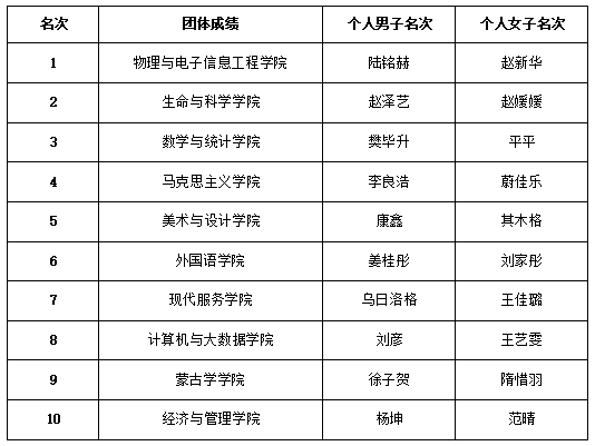 本比赛分为团体赛和个人赛,各学院的同学积极准备,经过激烈角逐,最终获得以下成绩: