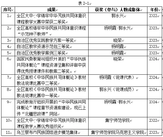 开展小学道德与法治骨干教师培训,派驻教师深入中学讲授思政课。近三年,教师社会宣传宣讲60余人次。2篇决策咨询报告被国家民委采纳, 1篇被北疆智库采纳。组织或参与中小学师资培训100多学时。1人被聘为自治区党委宣讲团成员、2人被聘为乌兰察布市委宣讲团成员。教师所获各类荣誉,详见表2-2。