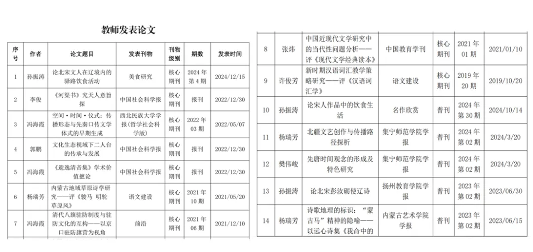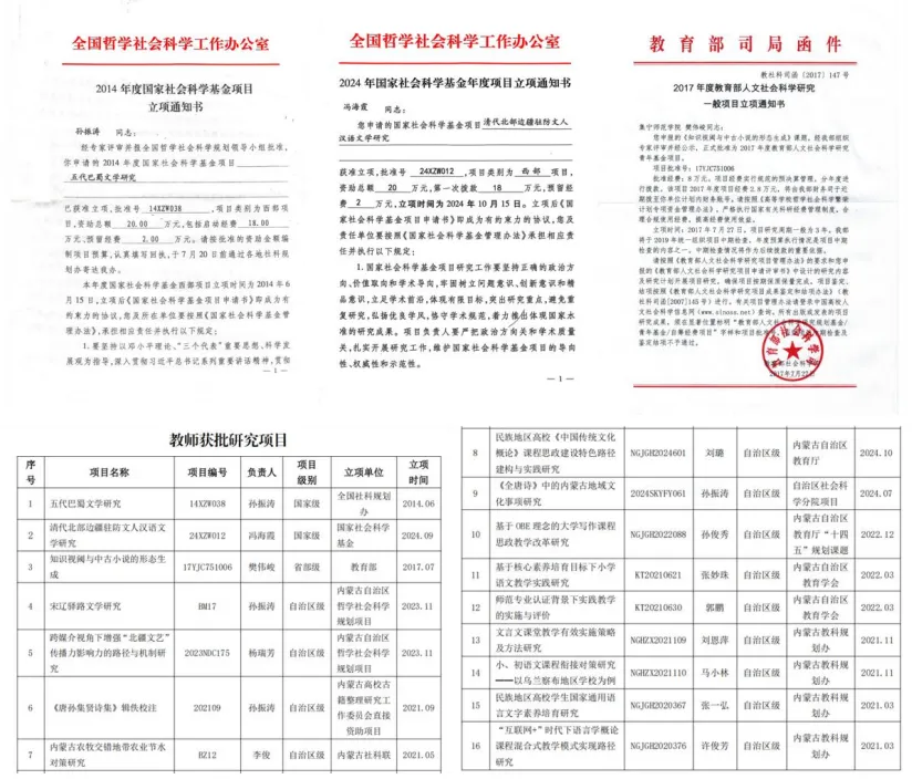 学院自升本以来,获批科研、教研项目200余项。其中,获批国社科项目2项、教育部项目1项、自治区级项目90余项,乌兰察布市项目20余项。付梓《汉字与中国古代文化》《乌兰察布汉语方言词语汇释》《四字新词语集锦》《中国古代小说新探》《<全唐诗>宗教名物意象考释》《唐诗宋词文化事项鉴赏》《无限的风景——内蒙古诗歌研究》等著作50余部;刊发《论北宋文人在辽境内的驿路饮食活动》《<河渠书>究天人意旨探》《空间·时间·仪式:传播形态与先秦口传文学体式的早期生成》等论文500余篇。诸师的科研活动在知识创新与突破、人才培养、服务社会等方面发挥了积极作用。
