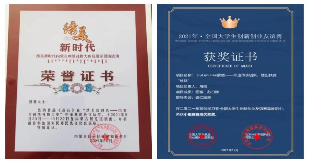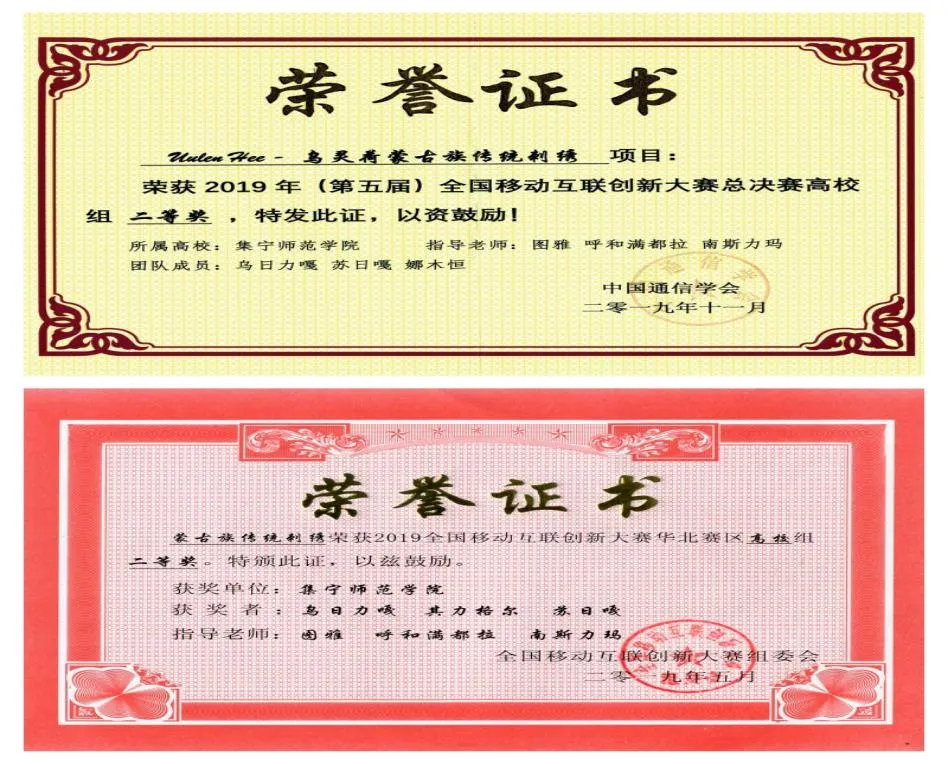 依托该特色课程平台,2019年“蒙古族传统刺绣”项目荣获全国移动互联创新大赛华北赛区高校组二等奖和全国移动互联创新大赛总决赛高校组二等奖。