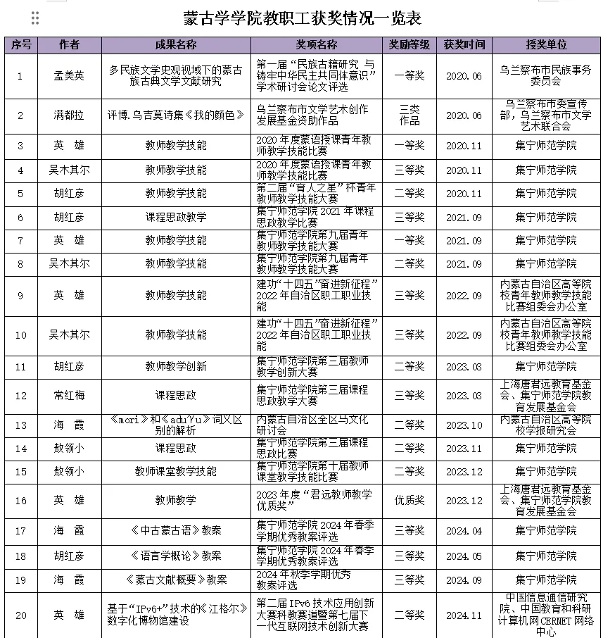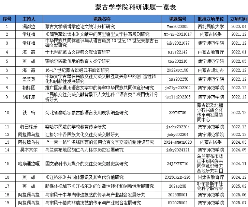学院在教学科研方面取得较好成果,近五年共获省部级课题 11 项,市校级项目 38 项。课题围绕蒙古学领域核心问题与前沿热点,具有较高学术价值和实践意义。