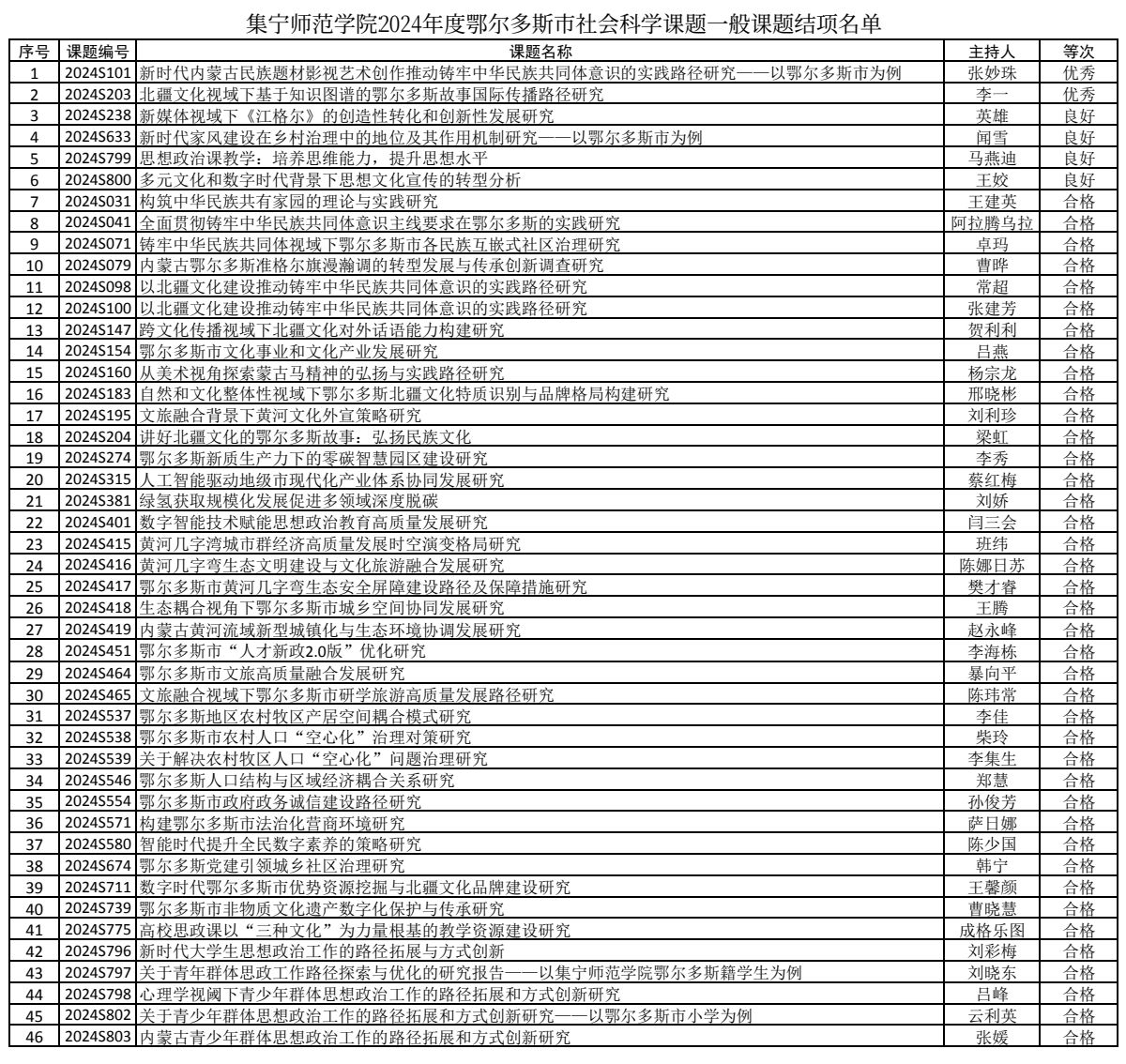 这些结项课题涵盖了文化与艺术、思想政治教育、社会治理与社区建设、经济与产业发展、生态与环境、教育与人才培养、科技与创新等多个领域,体现了PP电子游戏官网在社会科学领域的研究深度和广度,为鄂尔多斯地方经济社会发展提供了多方面的理论支持和实践指导。