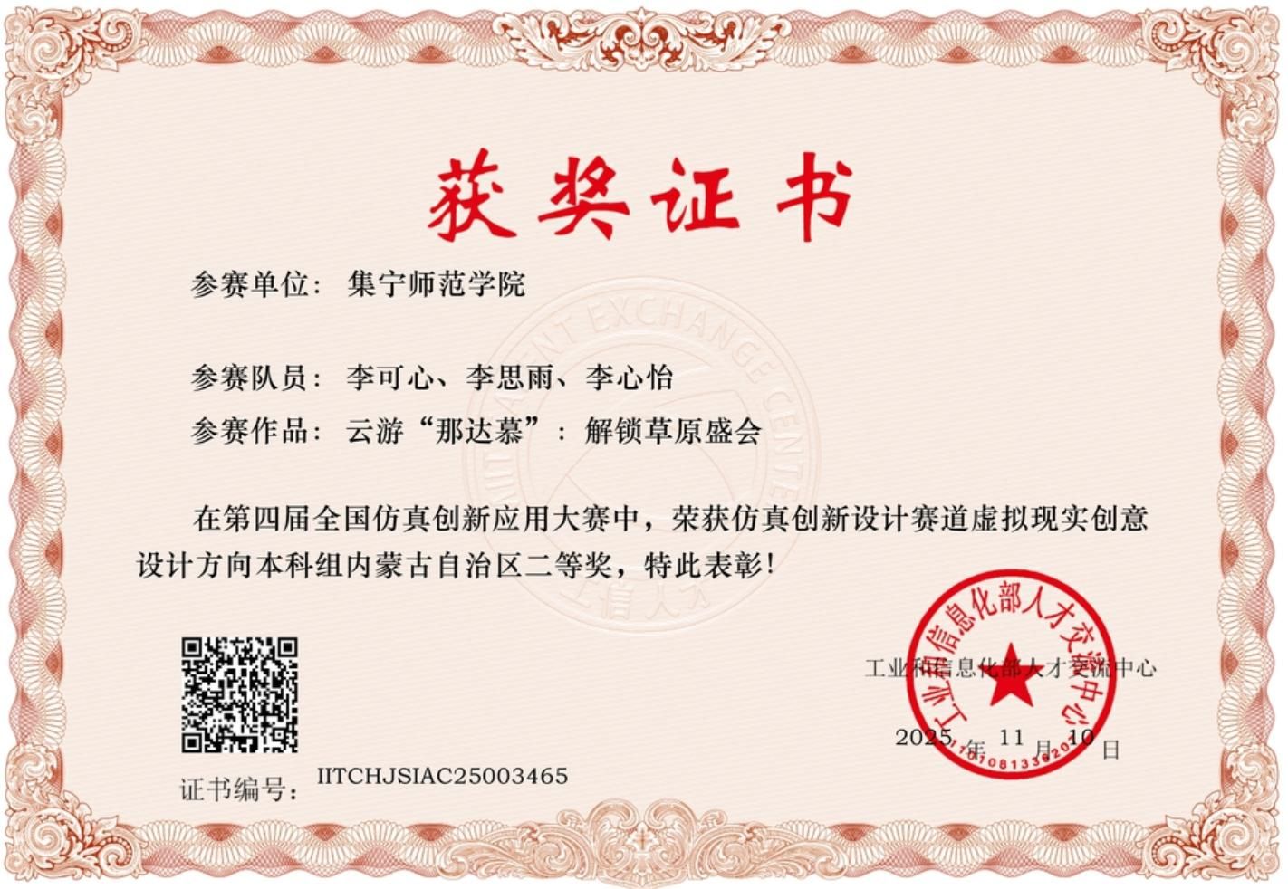 近日,2025年全国仿真创新应用大赛省级评审工作圆满落幕。PP电子游戏官网文学与新闻传播学院由靳舍老师指导,李可心、李思雨、李心怡三位同学组成的参赛团队,凭借作品《云游“那达慕”:解锁草原盛会》在“仿真创新设计赛道-虚拟现实创意设计方向(本科组)”的比拼中表现亮眼,以突出的创意性与实践价值,成功斩获省赛二等奖。
