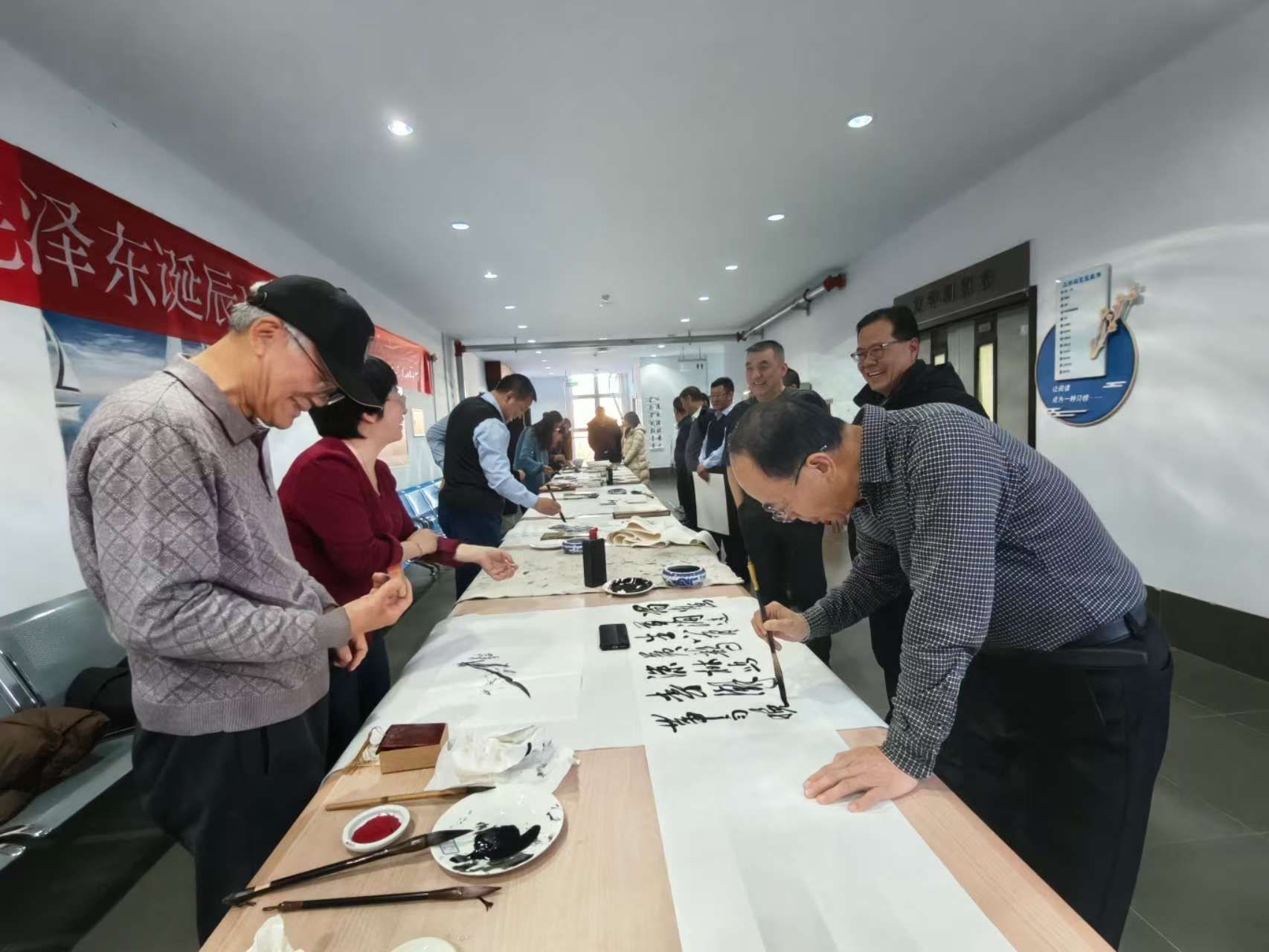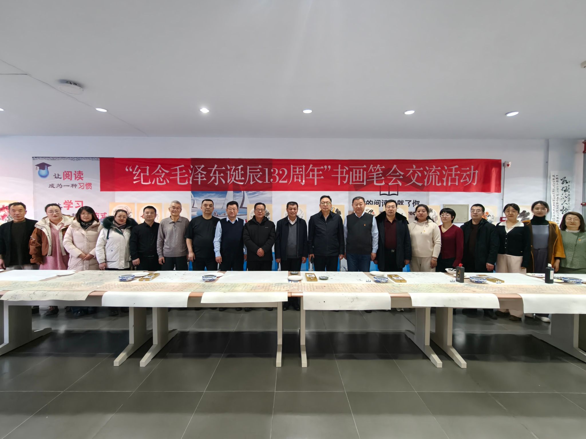 为深入学习贯彻习近平总书记关于用好红色资源、传承红色基因的重要论述,深刻缅怀毛泽东同志的丰功伟绩,激发师生爱国情怀与艺术创造力,12月25日,工会和离退休人员工作处党总支联合图书馆党支部,在泉山校区图书馆三楼举办“纪念毛泽东同志诞辰132周年”书画笔会交流活动。校党委副书记李景杰,党委委员、纪委书记、监察专员赵永军,党委委员、统战部部长赵向军,党委委员、组织部部长李瑞俊出席活动。学校离退休老同志代表、书画专业教师和学校书画爱好者参加了本次活动。