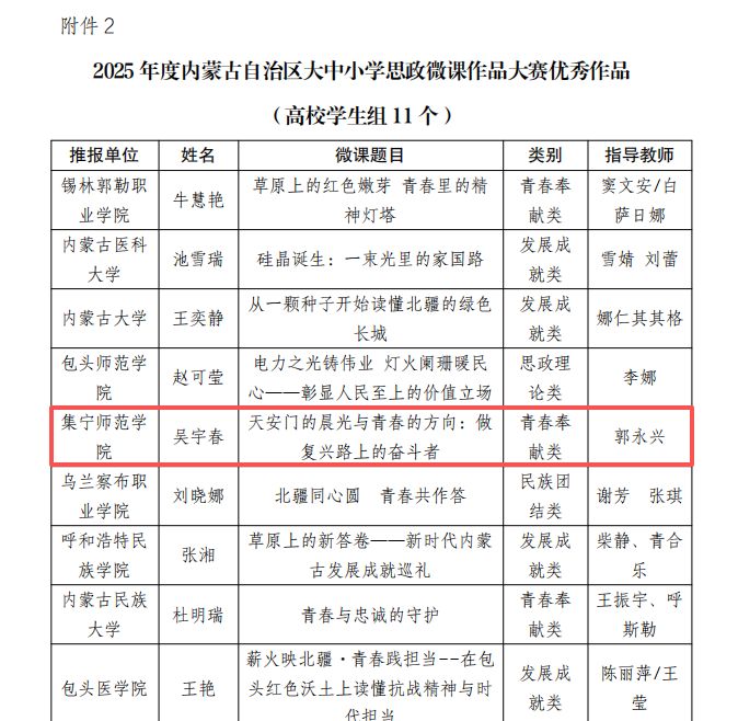 近日,由自治区团委主办的2025 年度内蒙古自治区大中小学思政微课作品大赛评选结果正式揭晓。本次大赛设置民族团结类、思政理论类、发展成就类、青春奉献类等多个类别,经审核推报、集中评审等环节,最终共评选出优秀微课作品60件,其中高校学生组11件。PP电子游戏官网马克思主义学院学生吴宇春在指导教师郭永兴的悉心指导下,其微课作品《天安门的晨光与青春的方向:做复兴路上的奋斗者》获评“高校学生组青春奉献类”优秀作品。