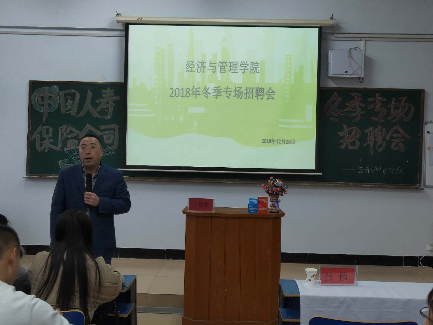 为提升我院2019届毕业生就业质量,更好地满足用人单位对我院人才的需求和广大毕业生的择业需求,12月20日下午,经济与管理学院2018年冬季专场招聘会在主教楼举行,会计、保险专业的应届毕业生参加了此次招聘会。本次招聘会分为例外空间与中国人寿保险公司两个专场,院长张伟莅临本次招聘会。