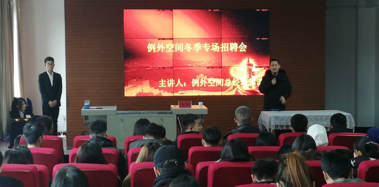 例外空间冬季专场招聘会上,总经理郭谦为我院2016级、2017级会计专业的在校大学生讲解了公司概况,并提出销售岗位及实习岗位工作人员的招聘需求。他提出,希望应聘者具有进取心,责任感等优良品质。