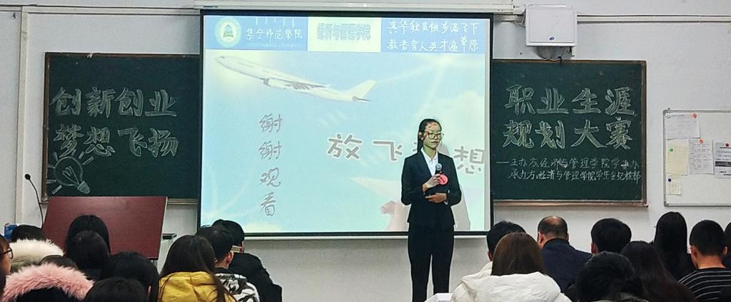 为了引导和示范职业生涯规划实践,提升我院学生职业素质和规划能力,帮助大学生树立正确的职业目标,推动我院就业工作的深入开展,2019年11月21日19:30,经济与管理学院在主教楼218教室开展了“创业创新,梦想飞扬”职业生涯规划大赛。曲建辉、郝文丽、邢彩霞老师三位老师担任评委,十一位同学参加了本次比赛。
