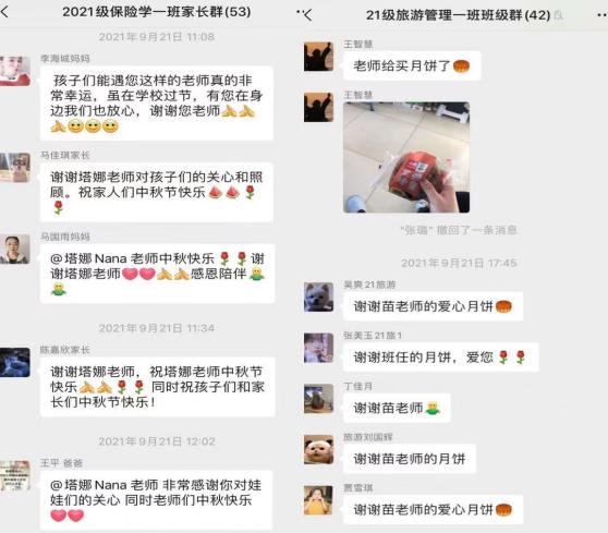 9月21日中秋当天,部分班主任放弃和家人团聚的时间,自费为同学们送上中秋慰问品和祝福,和同学们欢聚一堂,共庆中秋。让不能回家过节的同学感受到家的温暖,让同学们在学校度过一个别具意义的中秋佳节。