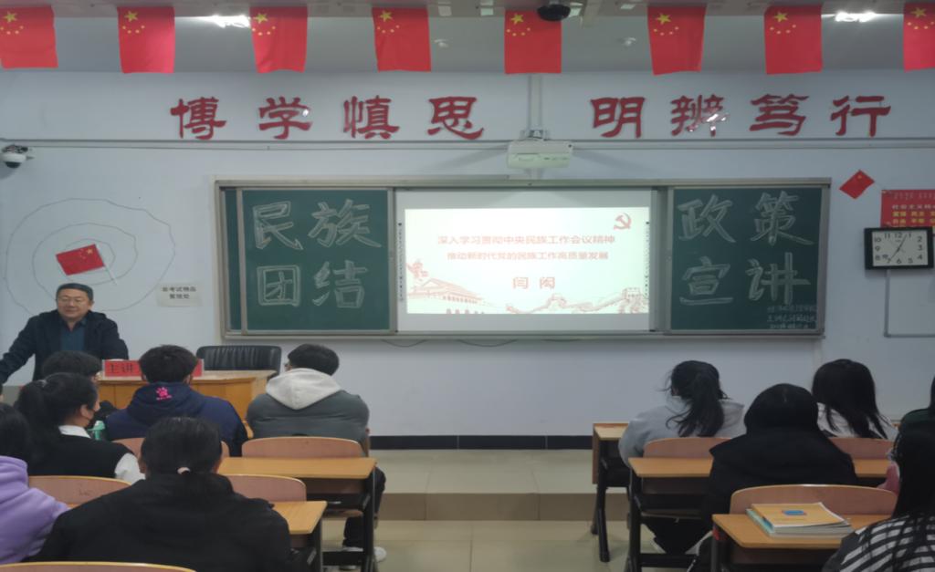 民族团结是维护社会稳定、祖国统一、国家长治久安的重要保证,维护民族团结和社会稳定是各族人民的共同愿望和根本利益所在。为进一步铸牢中华民族共同体意识,学生处处长闫闳11月15日晚在主教楼Z213为2021级财务管理一班的同学们进行了民族政策宣讲。