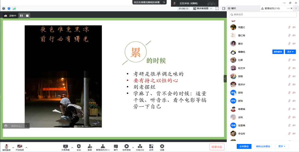 刘雅妮同学于2021年参加了研究生招生考试,成功被内蒙古师范大学法学类民族旅游专业录取。讲座上,刘雅妮细致讲解了考研备考方法,向同学们分享了她的实战考研经验。
