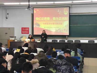2019年11月21日下午,计算机学院团总支组织2017级全体同学在主教楼215开展了“我们正青春,奋斗正当时”的考研宣讲会暨主题团课。计算机学院的焦丽仙老师和安达老师担任主讲。