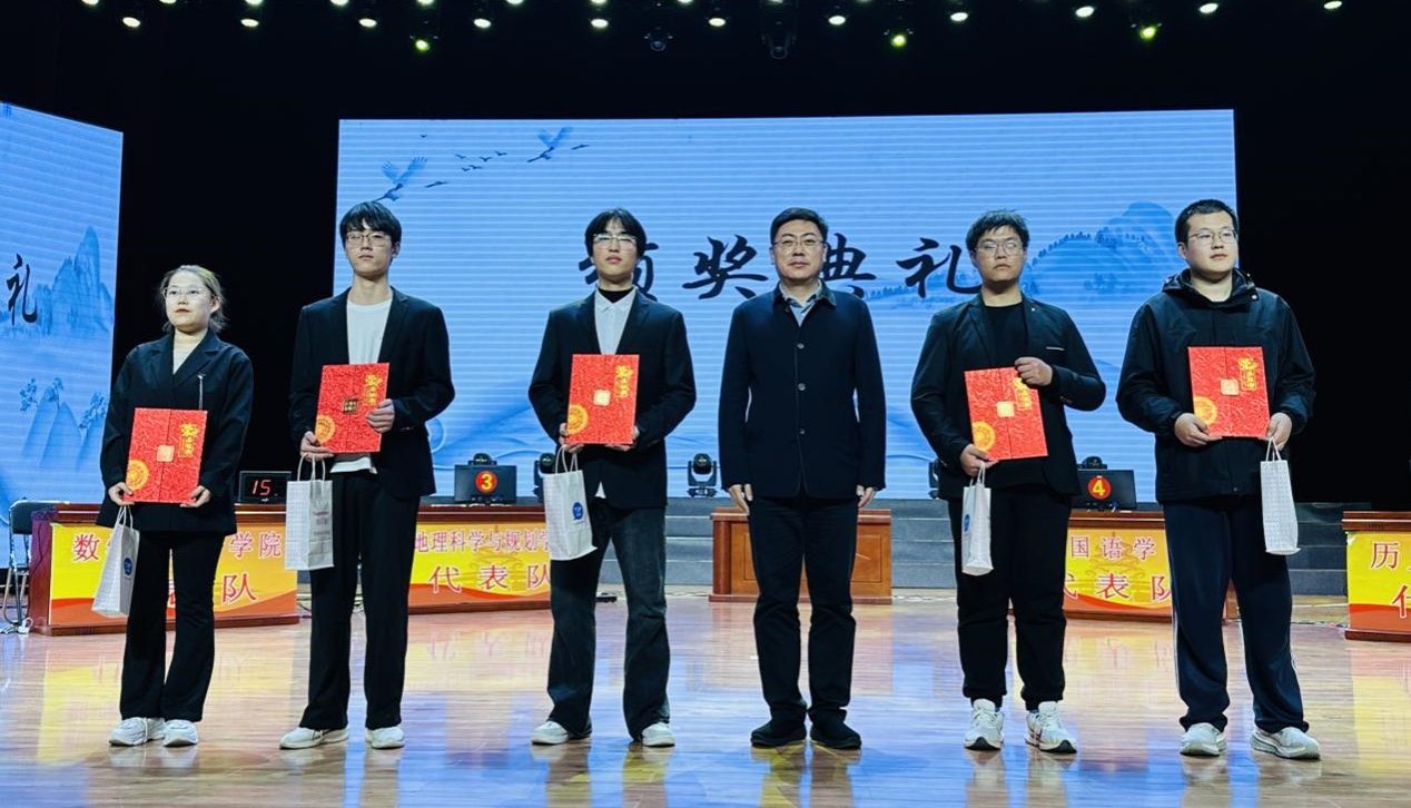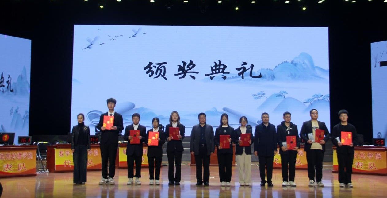 最终,文学与新闻传播学院代表队获得一等奖,化学与化工学代表队和外国语学院代表队获得二等奖,历史文化学院代表队、数学与统计学院代表队和地理科学与规划学院代表队获得三等奖。校领导及主要部门、二级学院负责人为获奖代表队颁奖。