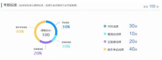 本课在智慧树平台是针对高校和社会学习者开放,课程考核形式多样、强调过程评价,主要是以视频学习和网上答题进行成绩的评定,平时成绩30%,章测试成绩10%,见面课程及20%,期末考试成绩40%进行成绩的评定。