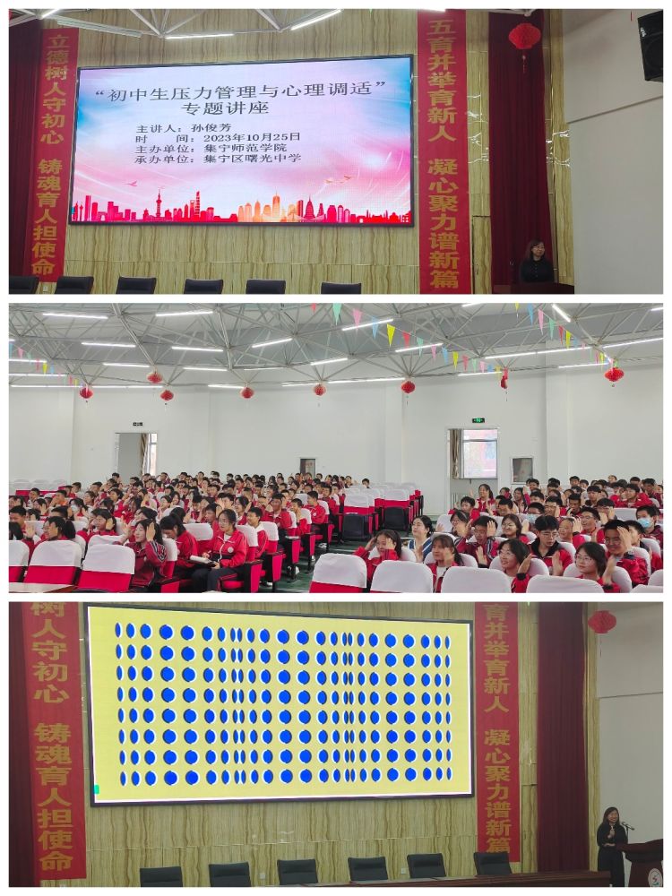 10月25日,继续教育学院开展“送培进校”活动,邀请孙俊芳老师在曙光中学开展“初中生压力管理与心里调试”减压讲座。