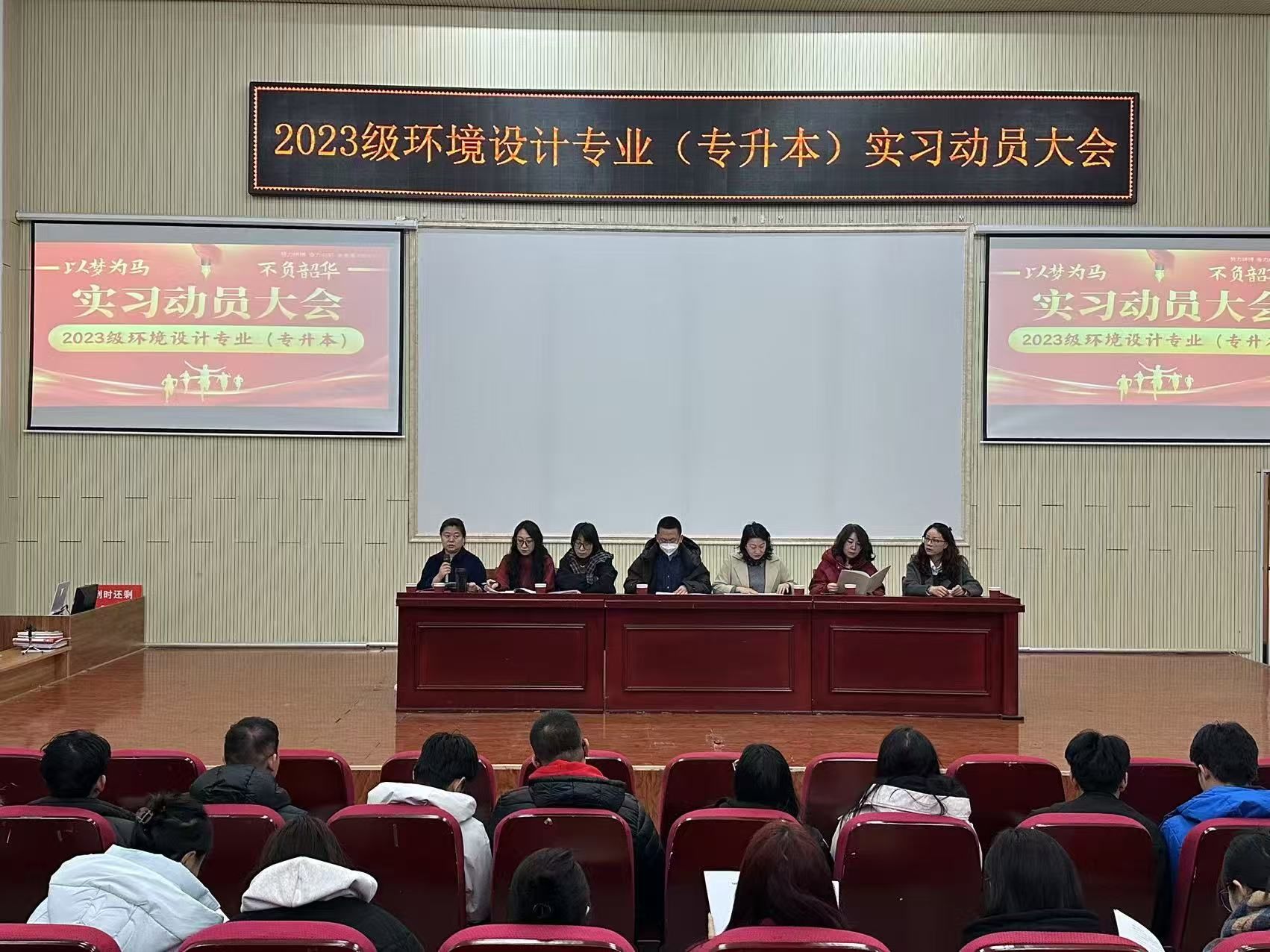 为进一步推动我院2025届毕业生实习工作顺利开展,明确实习要求,高质量完成实习实践。2025年3月4日午,美术与设计学院在报告厅召开2023级环境设计专业(专升本)专业实习动员大会。会议副院长马晓东主持,院长蔚淑英、环境设计系主任梁岩、教学科研科科长张晓蒙、副科长胡韶华、班主任郝非非、指导教师代表王媛媛出席,2023级环境设计专业(专升本)专业全体学生参加。
