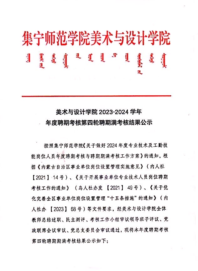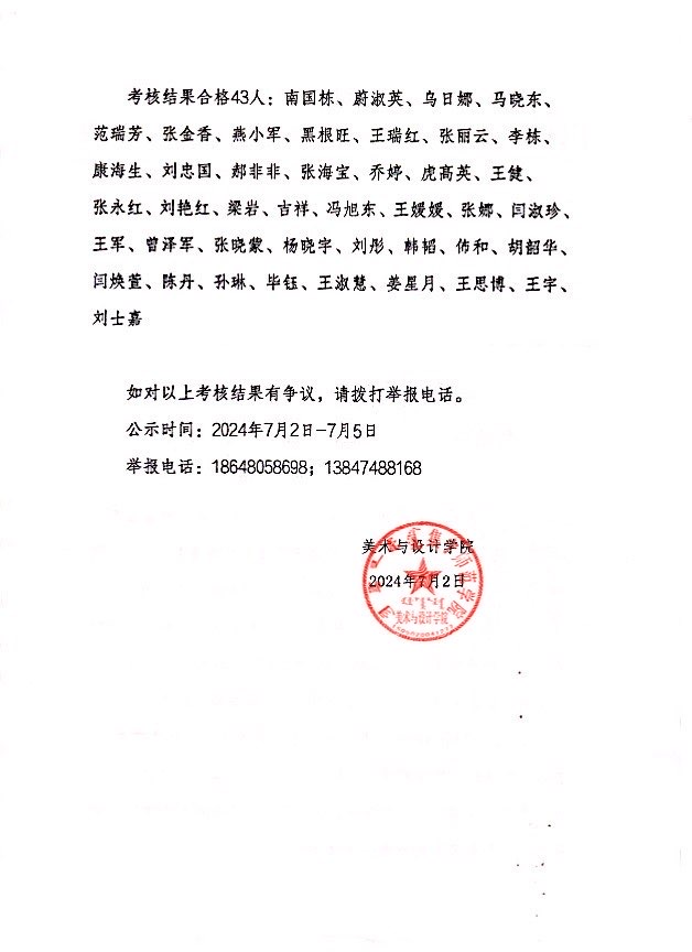 PP电子游戏平台网站美术与设计学院2023-2024学年年度聘期考核第四轮聘期期满考核结果公