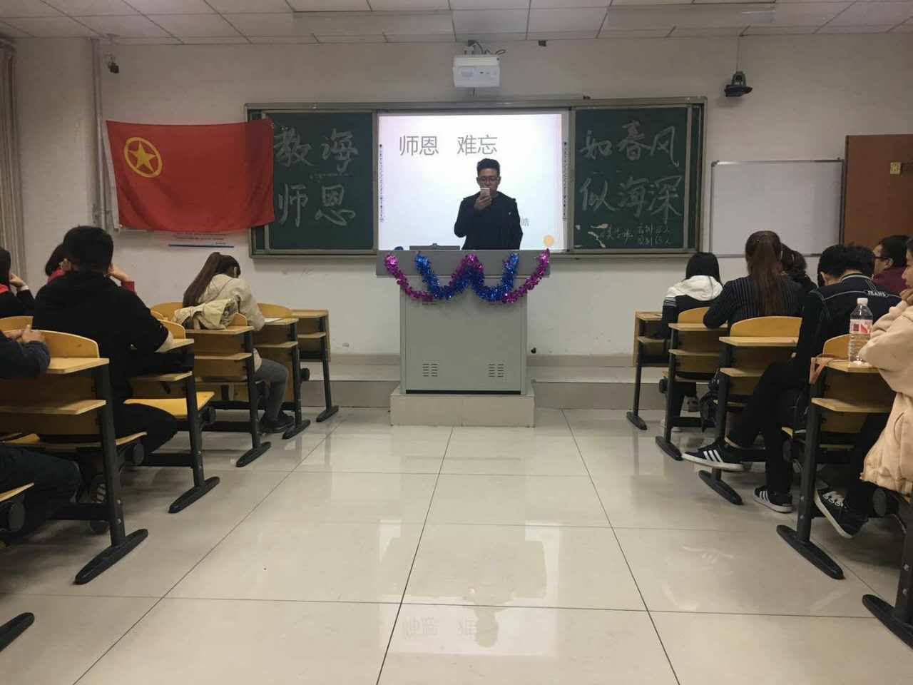 为了让同学感受到老师的辛苦和付出,为了培养学生尊重老师、关心老师的良好品质,让每个同学从自己的角度了解教师、尊重教师,通过实际行动表达对老师敬意,体验到尊敬老师的愉悦感受。PP电子游戏平台网站美术学院于2017年9月27日晚七点美术学院205教室开展“教诲如春风,师恩似海深”主题团日活动。