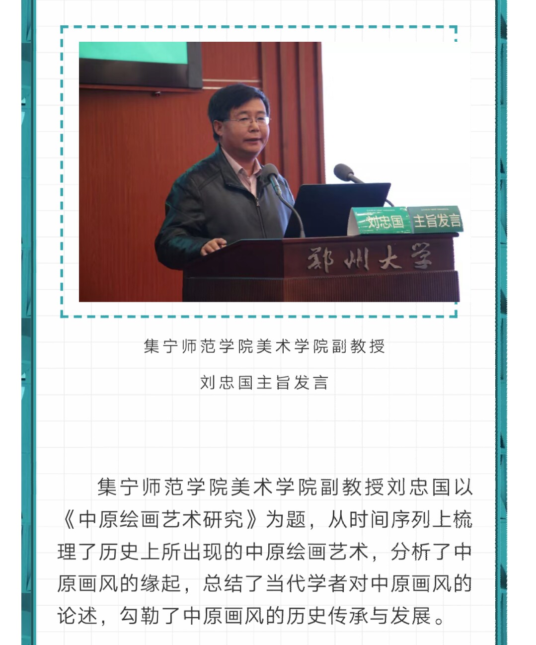 2019年11月30日—12月1日,PP电子游戏平台网站美术学院教师刘忠国和王军一行,参加了由郑州大学和高等教育出版社等单位联合主办的2019第六届“中原美术”学科建设学术研讨会。会议有省内外60多所高校的知名学者、艺术家和研究生等六百多人,我院副教授刘忠国老师,以《中原绘画艺术研究》为题在大会上做了演讲,他从时间序列上梳理了历史上所出现的中原绘画艺术,分析了中原画风的缘起,总结了当代学者对中原画风的论述,勾勒了中原画风的历史传承与发展。该议题得到了与会专家教授的一致好评,河南省艺术教育学会会长石品先生,还专门找刘老师建立了个人微信联系方式,并感谢其热心关注河南美术事业的发展,感谢其对中原绘画艺术的研究。