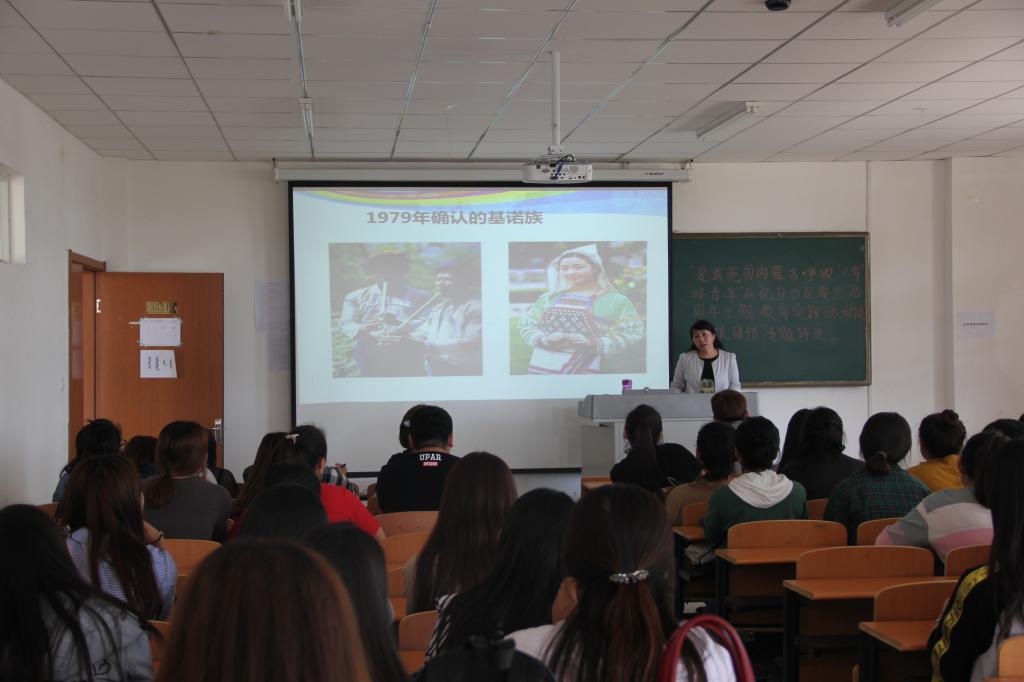 蒙文系团总支于5月17日下午在白海校区蒙文系教学楼5311教室举办“爱我亮丽内蒙古·争做‘六有’好青年”庆祝自治区成立70周年主题教育活动之“民族团结”专题讲座。蒙文系团总支书记白秀梅、音乐系团总支书记周丽青及白海校区四个系院学生代表70余人聆听讲座。