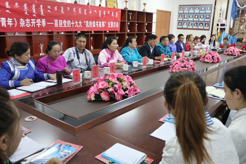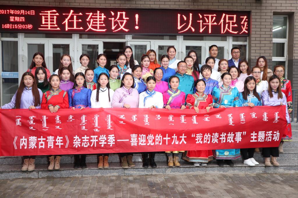 2017年9月14日下午,蒙文系团总支与《内蒙古青年》杂志社联合举办喜迎党的十九大“我的读书故事”主题活动。系主任南斯力玛、系党总支副书记朝格图、《内蒙古青年》杂志社主编照日格图、编辑都义乐、包卫民、红雁、吉雅泰、额尔敦毕力格、呼和图嘎及蒙文系15.16级部分学生代表参加活动。活动由蒙文系团总支书记白秀梅主持。