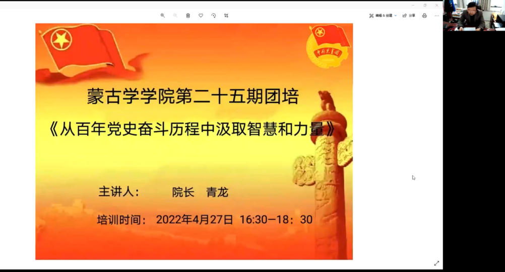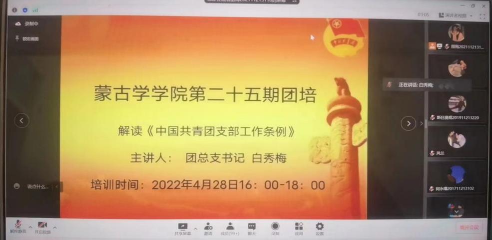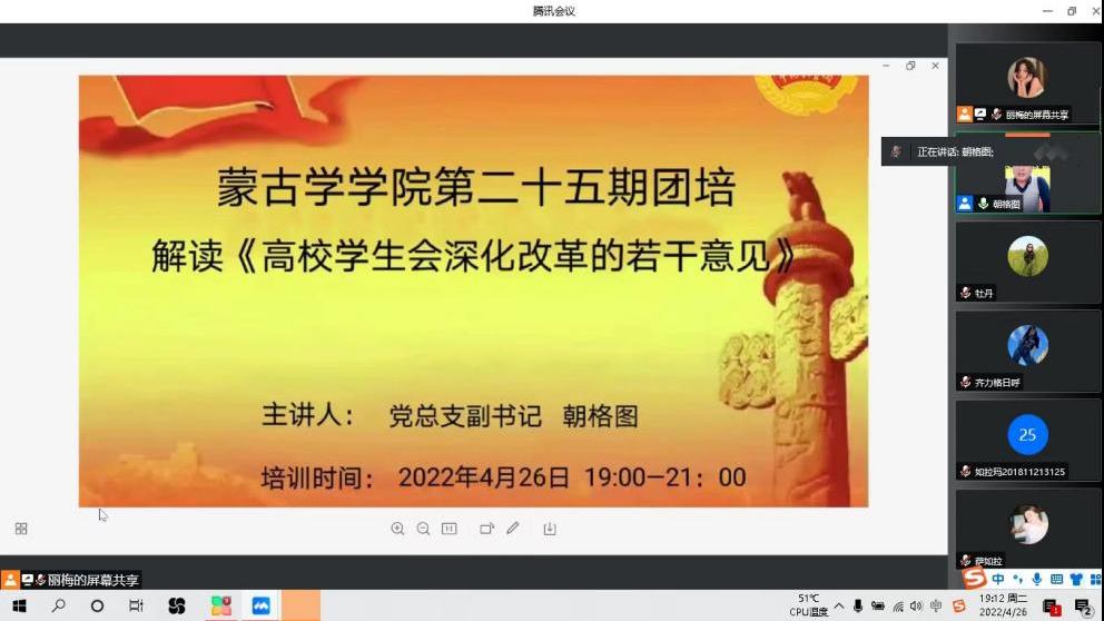 为认真学习贯彻习近平新时代中国特色社会主义思想,全面贯彻落实党的十九大和十九届历次全会精神,深入贯彻落实习近平总书记关于青年工作的重要思想和对内蒙古重要讲话重要指示批示精神,加强和改进新时代团员教育培训工作,切实保持和增强团员先进性和光荣感,进一步教育引导广大团员青年深刻感悟“两个确立”的决定性意义,不断增强“四个意识”,坚定“四个自信”,做到“两个维护”,珍惜团员身份,提高自身素质,切实发挥模范带头作用,根据《中国共产主义青年团章程》《中国共产主义青年团团员教育管理工作条例(试行)》《PP电子游戏平台网站团员教育培训工作实施办法》和《2022年度全校共青团工作安排》等文件精神,按照学校团委相关安排部署,蒙古学学院开展了第二十五期团员培训,培训于4月26日至30日,以线上形式开展。本次团培共参加198人。