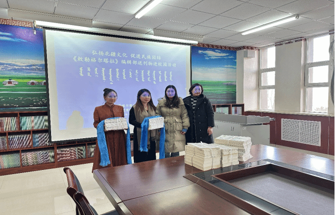 在本次活动中,《敕勒格尔塔拉》编辑部向蒙古学学院赠送了《敕勒格尔塔拉》文学期刊及相关文学丛书,并通过专题讲座和座谈会等形式与学院师生进行了深入交流。吉胡兰图副主席详细介绍了举办此次活动的意义,并对《敕勒格尔塔拉》期刊的发展历程、目前存在的问题等进行了介绍,同时对蒙古语言文学专业学生提出了几点建议与希望。蒙古学学院院长孟美英对吉胡兰图副主席一行的莅临表示热烈欢迎,并对学院的基本情况进行了全面介绍,同时对《敕勒格尔塔拉》编辑部的慷慨赠书表达了诚挚的谢意,回顾了与编辑部的交流历史,强调了未来加强合作的意向。