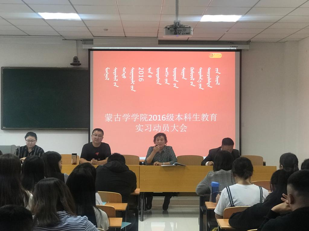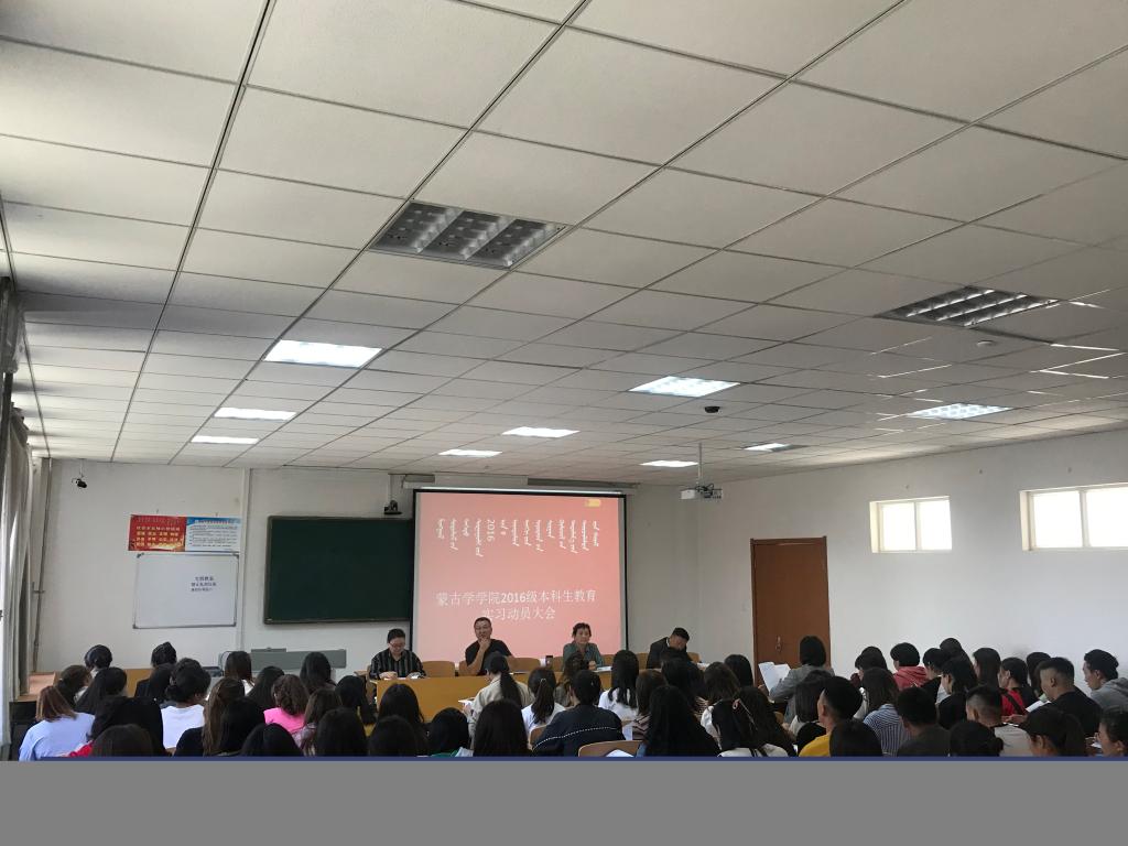 8月31日下午, 我院举行了2016级蒙古语言文学、学前教育(蒙授)两个专业师范生教育实习动员大会。院长南斯力玛、副院长呼和满都拉、蒙古语言文学专业负责人乌恩其、学前教育(蒙授)专业负责人娜仁图雅及全体教育实习指导教师出席动员大会,蒙古语言文学专业35名师范生、学前教育(蒙授)专业40名师范生参加此次活动。