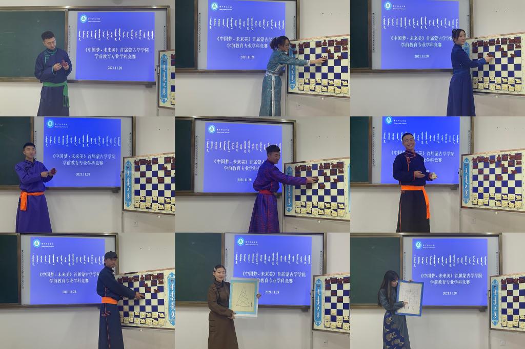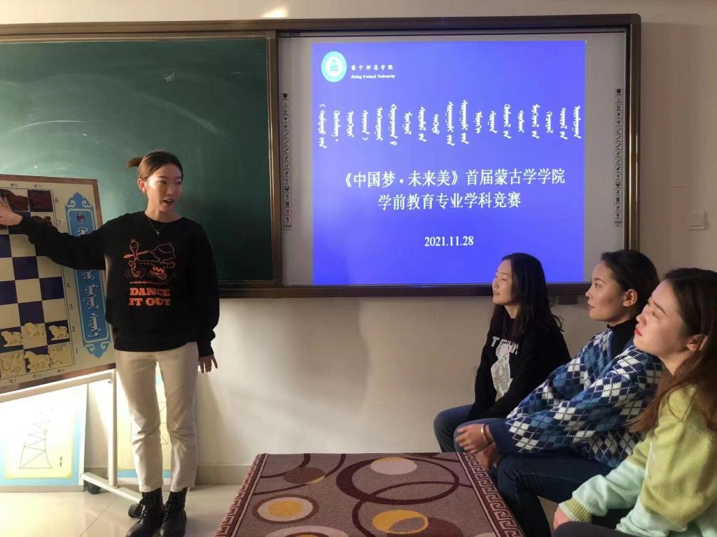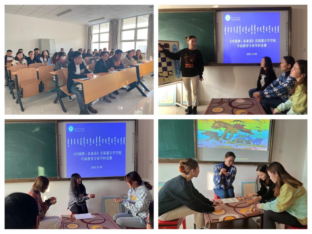 为促进我院学前教育专业的建设与发展,为学前教育专业的学生提供相互交流和学习的机会,加强学前教育专业学生师范技能的训练,结合《蒙古族传统游戏》课程的教学要求,11月28日,由教学科与学前教育教研室举办的《中国梦·未来美》首届学前教育专业学科竞赛在白海校区5号楼403教室进行。
