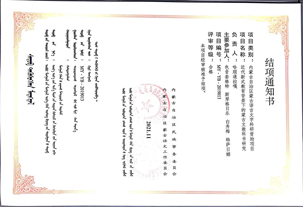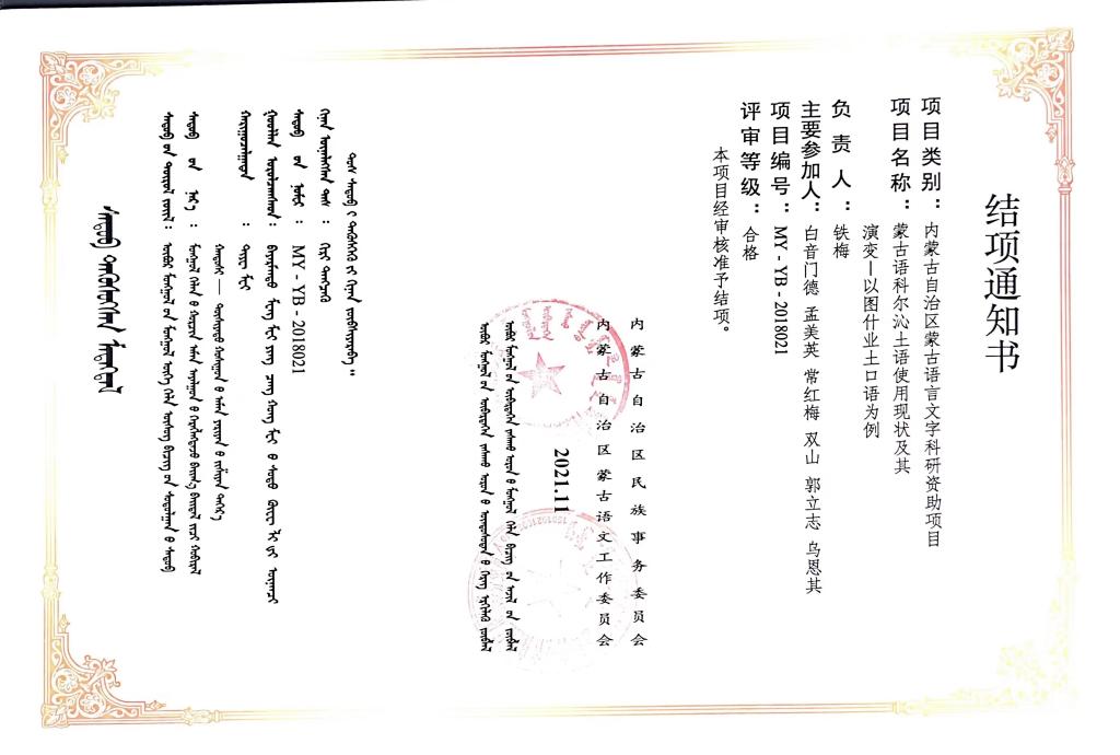 2021年9月28日,自治区民委组织召开地方民族语言文字科研项目专家评审会,依据《自治区民委地方民族语言文字科研项目管理办法》有关规定,对往年部分课题进行专家评审。经认真评审,专家组同意对“蒙汉俄英对照常用词图解词典”等99个课题予以结项。期中包括PP电子游戏平台网站蒙古学学院的4项课题。具体项目如下:
