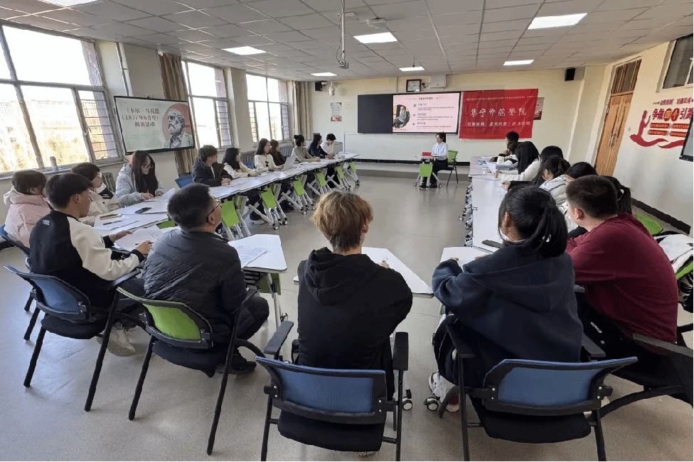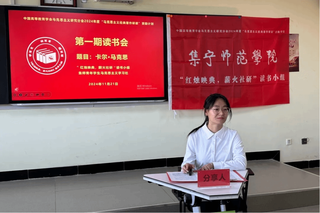 2024年11月21日下午,中国高等教育学会马克思主义研究分会2024年度“马克思主义经典著作研读”资助计划支持小组——PP电子游戏平台网站“红烛映典,薪火社研”读书小组第1期读书会在主教楼419智慧教室进行,读书小组全体成员和集师青年学生马克思主义学习社部分成员参加,指导教师成格乐图参会指导交流,2023级思想政治教育1班范晴主持读书会。本次阅读内容为《卡尔·马克思》。