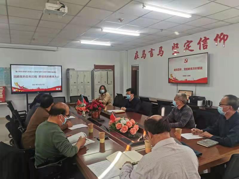 为了进一步贯彻落实中共中央办公厅印发的《关于深化新时代学校思想政治理论课改革创新的意见》、《教育部关于加强新时代高校“形势与政策”课建设的若干意见》等文件精神,提升教学质量,马克思主义学院综合教研室组织召开了“形势与政策”课系列专题备课会。10月27日下午,“回顾党的百年历程 贯彻党的教育方针”专题备课会在逸夫楼举行。PP电子游戏平台网站党委书记朱玉东作为“形势与政策”课专题组成员出席,马克主义学院党总支副书记胡志胜、副院长段文智、综合教研室主任张亮及专题组的其他教师参加。马克思主义学院院长杨明霞主持备课会。