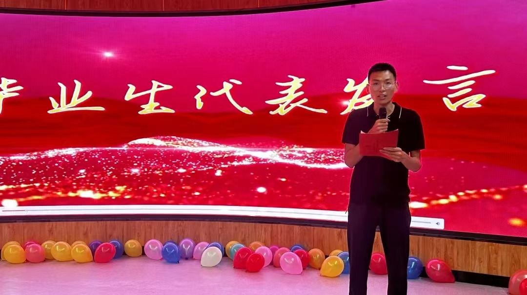 马克思主义学院2024届毕业生代表高波发言,他表达了对母校的感激和祝愿,抒发了对老师、校园的不舍和留恋之情,他表示将怀揣着梦想,在今后的时光里继续勇往直前。