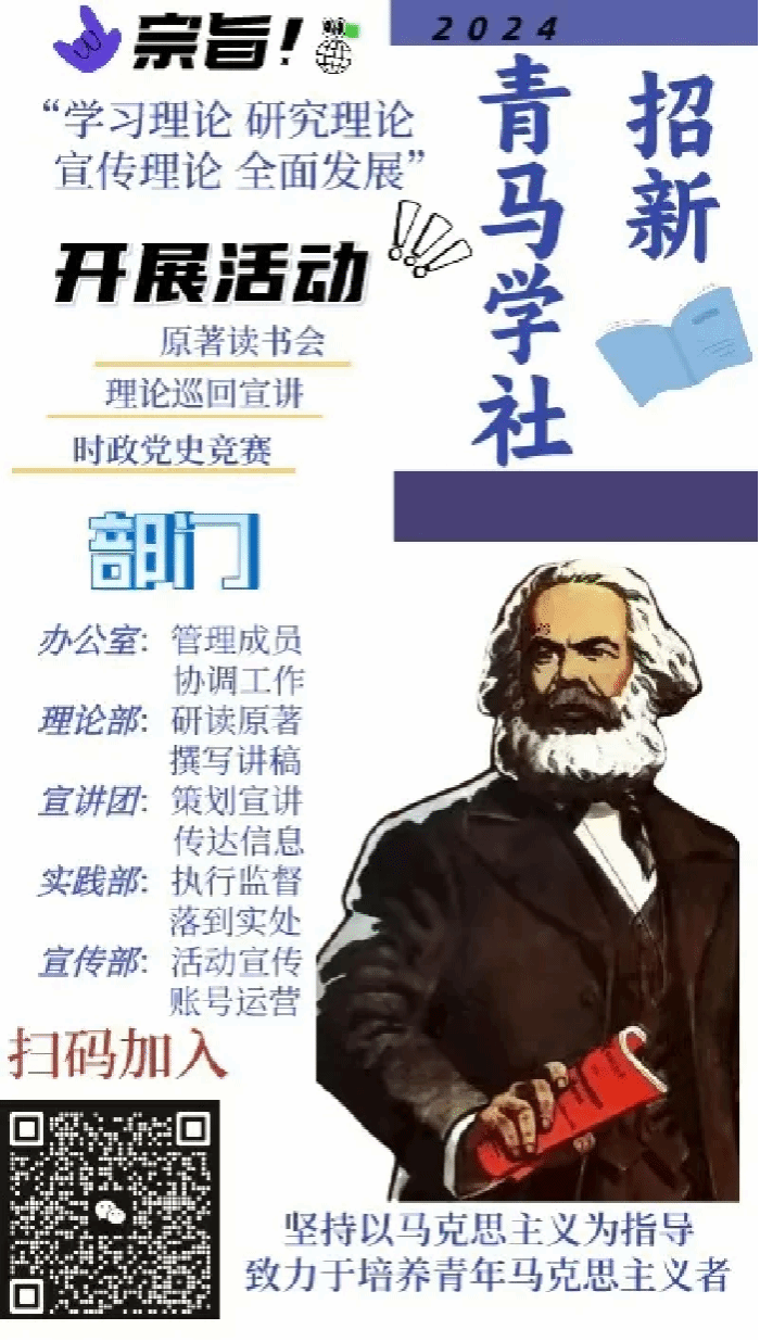 集师青年学生马克思主义学习社的宗旨是“学习理论、研究理论、宣传理论、全面发展”,坚持以马克思主义为指导,致力于培养青年马克思主义者。我们会通过开展原著读书会、理论巡回宣讲、时政党史竞赛等活动,提高社团成员的思想政治素质、理论水平和实践能力,培养全面发展的新时代大学生。积极引导青年学生树立正确的世界观、人生观、价值观,坚定共产主义理想信念,增强社会责任感和使命感。积极主动传播马克思主义科学理论,弘扬社会主义核心价值观,为实现中华民族伟大复兴的中国梦贡献青春力量。