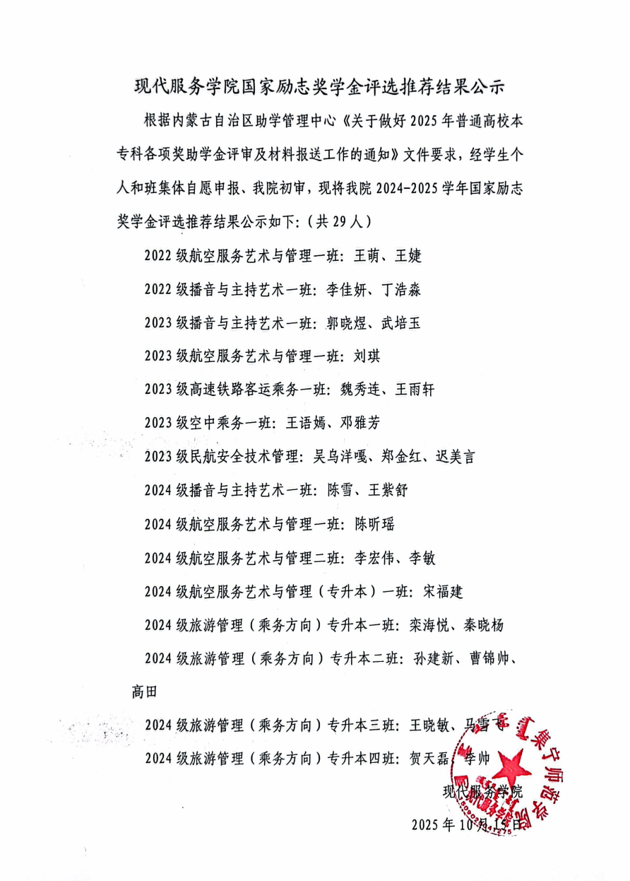 现代服务学院2024—2025学年国家励志奖学金评选推荐结果公示