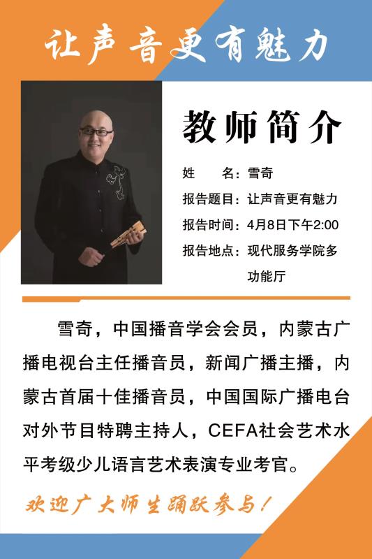 现代服务学院为了促进教学质量提升、加强师资队伍建设、丰富教学实践内容,落实OBE人才培养理念,4月8日14:30我们非常荣幸地邀请到内蒙古电视台的雪奇老师,来为我们做学术讲座,讲座地点在现代服务学院楼一楼多功能厅。