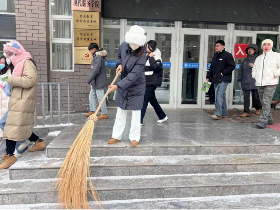 为进一步弘扬志愿服务精神、畅通学校道路、消除隐患,确保师生在校的安全和教育教学活动的正常进行。2023年12月11日上午,现代服务学院开展区域扫雪活动,学生干部及志愿学生参加此次活动。为进一步弘扬志愿服务精神、畅通学校道路、消除隐患,确保师生在校的安全和教育教学活动的正常进行。2023年12月11日上午,现代服务学院开展区域扫雪活动,学生干部及志愿学生参加此次活动。