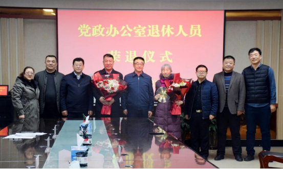 刘春、李凤斌为温世明、栗英老师颁发荣退证书并赠送鲜花。