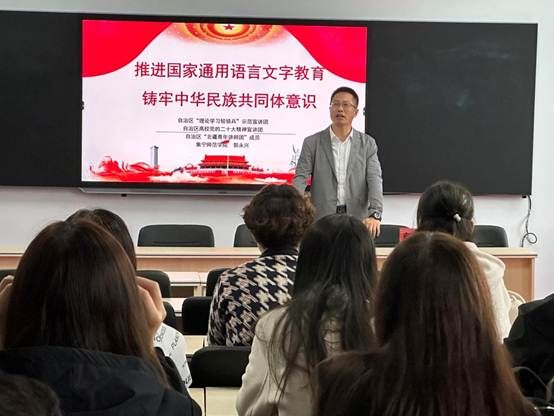 开班仪式结束后,内蒙古自治区党的二十大精神宣讲团成员、内蒙古自治区“理论学习轻骑兵”示范宣讲团成员、PP电子游戏平台网站马克思主义学院副院长郭永兴为学员作了题为《大力推进国家通用语言文字教育,铸牢中华民族共同体意识》的开班第一讲。