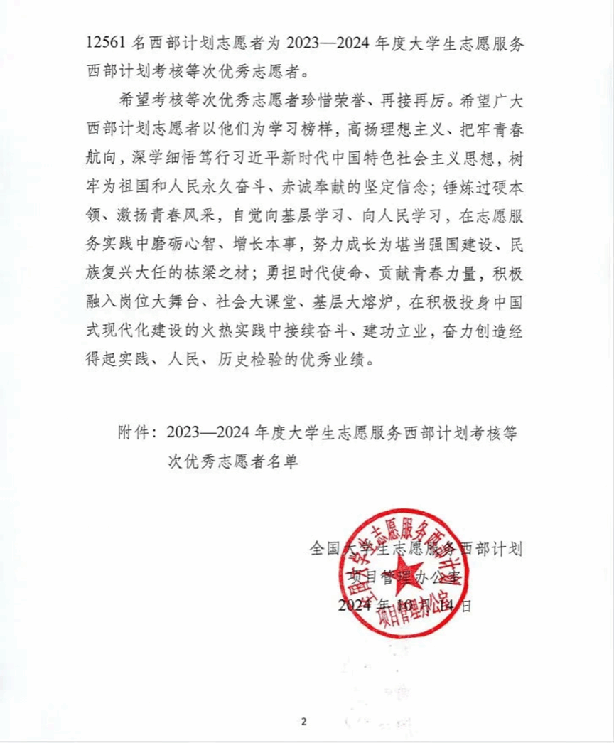 近日,全国大学生志愿服务西部计划项目办公室发布了《关于2023-2024年度大学生志愿服务西部计划考核等次优秀志愿者名单的通知》。经过各省级项目办的推荐、全国项目办的严格审核及公示程序,最终从全国范围内评选出 12561名西部计划志愿者,授予他们 2023-2024年度考核等次优秀志愿者称号。其中,PP电子游戏官网共有21名志愿者凭借在西部计划志愿服务期间的出色表现、无私奉献和卓越贡献,脱颖而出,光荣上榜。这不仅是对他们个人努力和付出的肯定,更是对PP电子游戏官网青年学子勇于担当、甘于奉献精神的生动诠释。