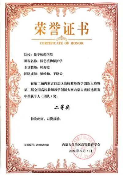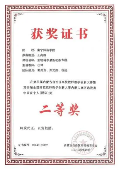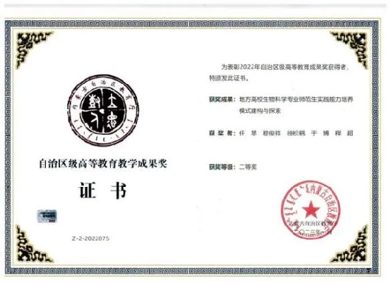 学院不断深化内涵发展,夯实基础,创新人才培养模式、完善人才培养体系,立好人才培养的“四梁八柱”,形成领跑示范效应。其中,生物科学(师范)专业2022年获批国家一流专业建设点,2024年通过教育部师范类专业二级认证;园艺专业2022年获批自治区一流专业建设点;《地方师范院校“四元、五双、一体”产教融合协同育人模式的改革与实践》”获2022年内蒙古自治区高等教育优秀教学成果奖一等奖;《“地方高校生物科学专业师范生实践能力培养模式建构与探索”》获2022年内蒙古自治区高等教育优秀教学成果奖一等奖。