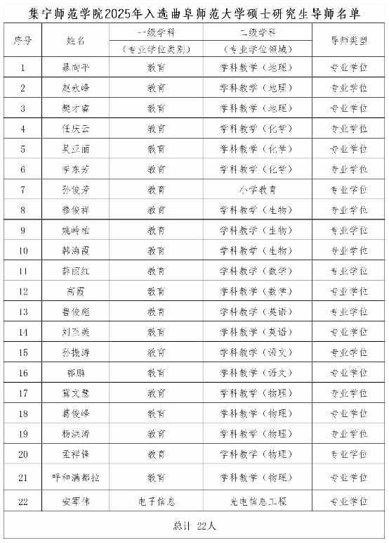 通过二级学院申报、研究生院推荐,经过曲阜师范大学审核,PP电子游戏官网22名教师成功入选曲阜师范大学硕士研究生导师。