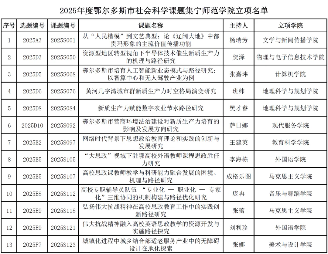 近日,鄂尔多斯市社会科学联合会正式发布《关于2025年度鄂尔多斯市社会科学课题立项的通知》。2025年度鄂尔多斯市社会科学课题共收到申报材料1026项,经专家严格评审,共有124项课题获准立项,PP电子游戏官网有13项课题成功入选。