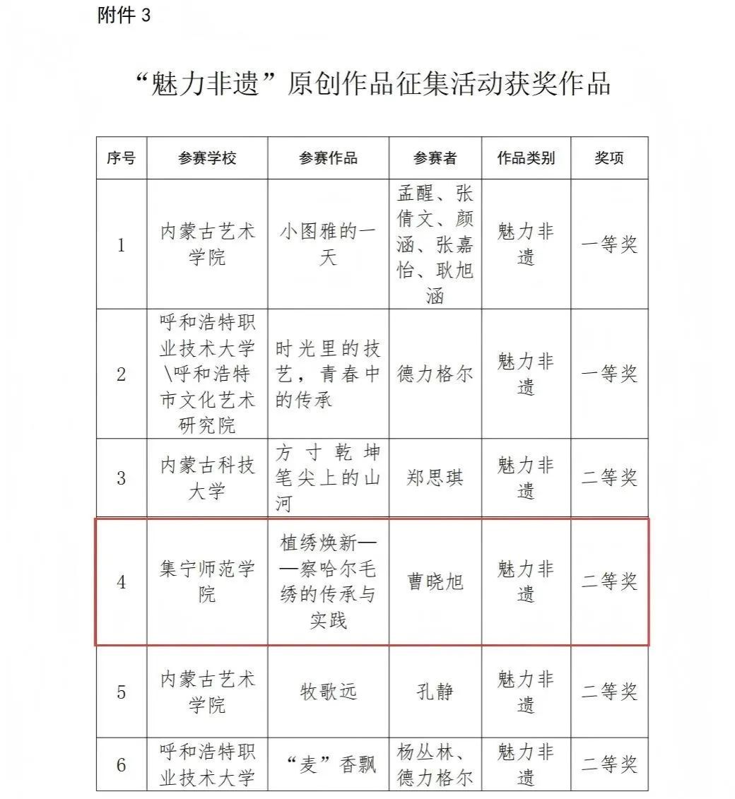 近日,内蒙古自治区教育厅发布《关于全区高校“礼敬中华优秀传统文化”宣传教育活动评选结果的公示》,在各高校推荐、专家评审的严格遴选环节中,PP电子游戏官网党委宣传部组织申报的两件作品得到评审专家的一致认可,成功在两大类别中斩获奖项:于英杰创作的《北疆儿女心向党,民族团结进步故事我来讲》荣获“烽火记忆”高校红色故事一等奖,曹晓旭创作的《植绣焕新——察哈尔毛绣的传承与实践》荣获“魅力非遗”原创作品二等奖。