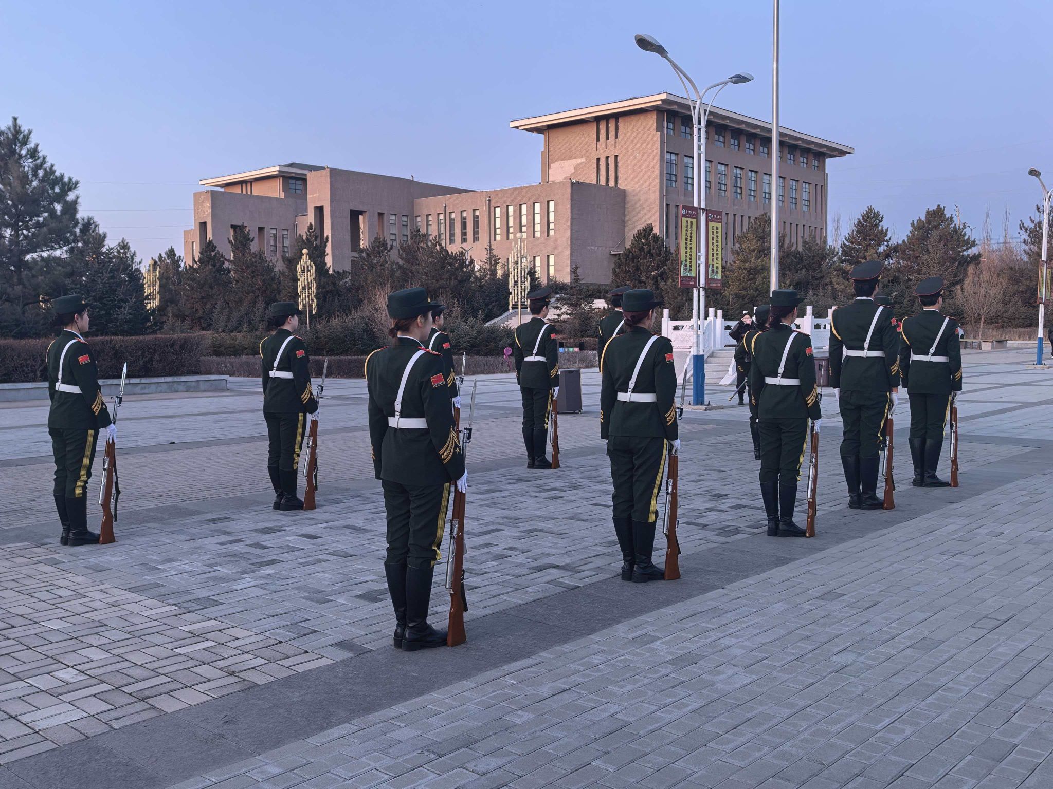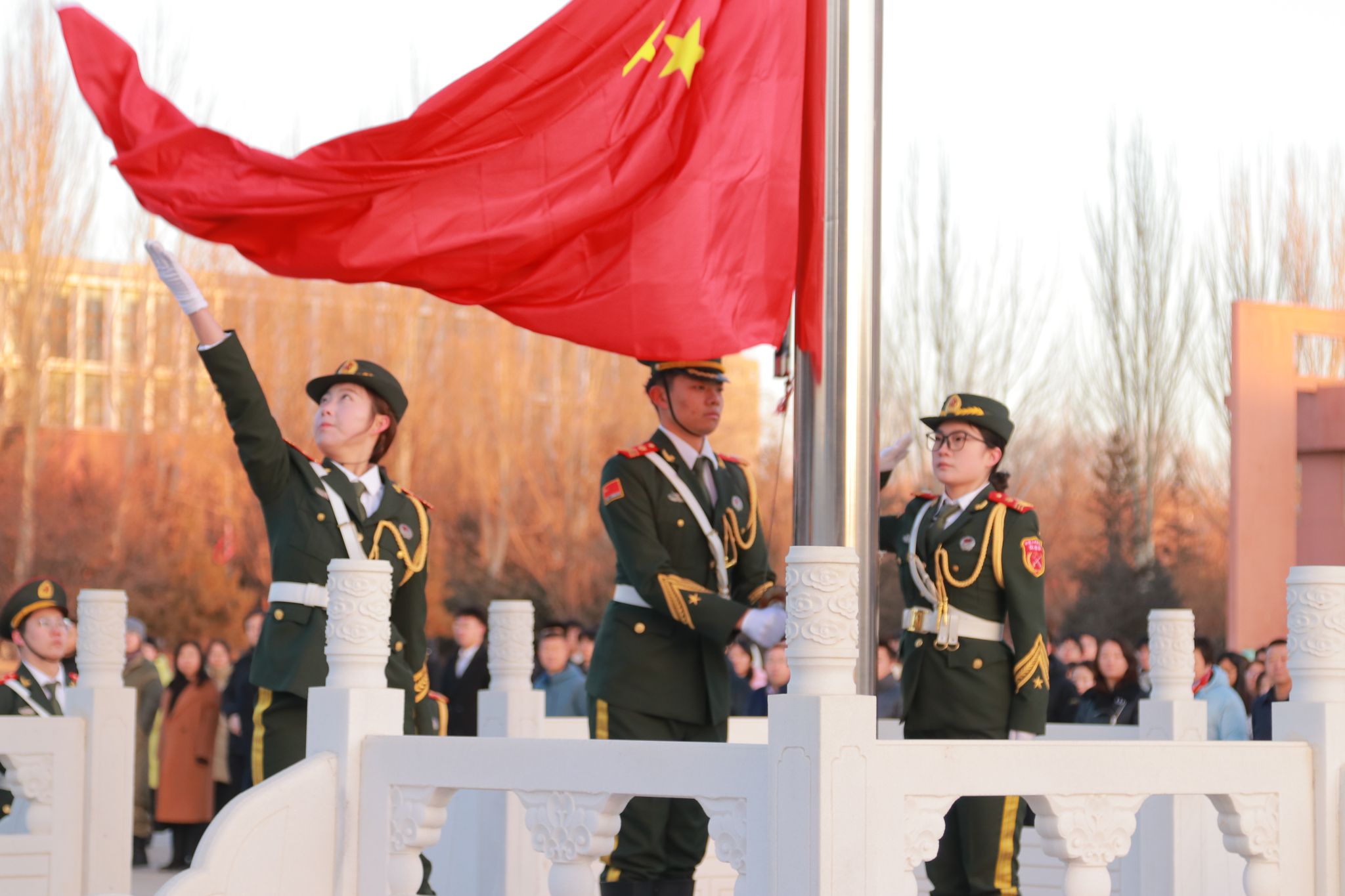 升国旗仪式在庄严的氛围中正式拉开帷幕。校国旗护卫队队员身着整齐服装,精神昂扬、身姿挺拔,迈着铿锵有力、整齐矫健的步伐,昂首阔步走向升旗台。全体师生神情庄重、肃立致敬,面向国旗行注目礼。随着“升国旗、奏国歌”的口令下达,雄壮的国歌声响彻两校区校园,鲜艳的五星红旗迎着春风冉冉升起,全体师生目光坚定、满怀崇敬,在国歌声中抒发拳拳爱国之心。
