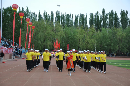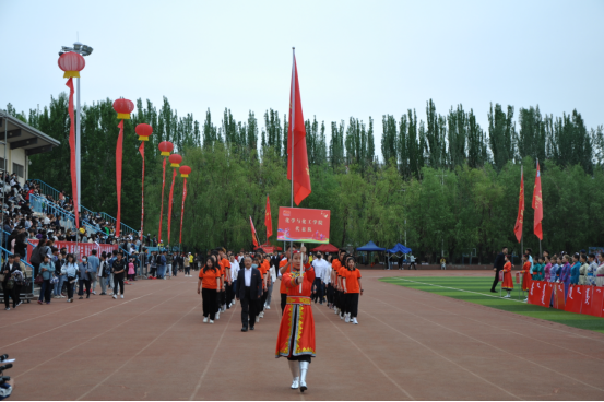 踏着清风与阳光,运动员与裁判员方阵迈着整齐的步伐进入田径场。