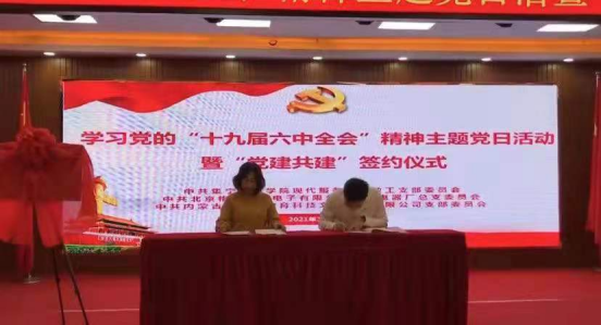 为全面推进学院党建工作深入开展,12月17日,现代服务学院教工支部和中共内蒙古宏星院教育科技文化发展有限公司党支部举行“党建共建”签约仪式暨十九届六中全会专题学习主题党日活动。